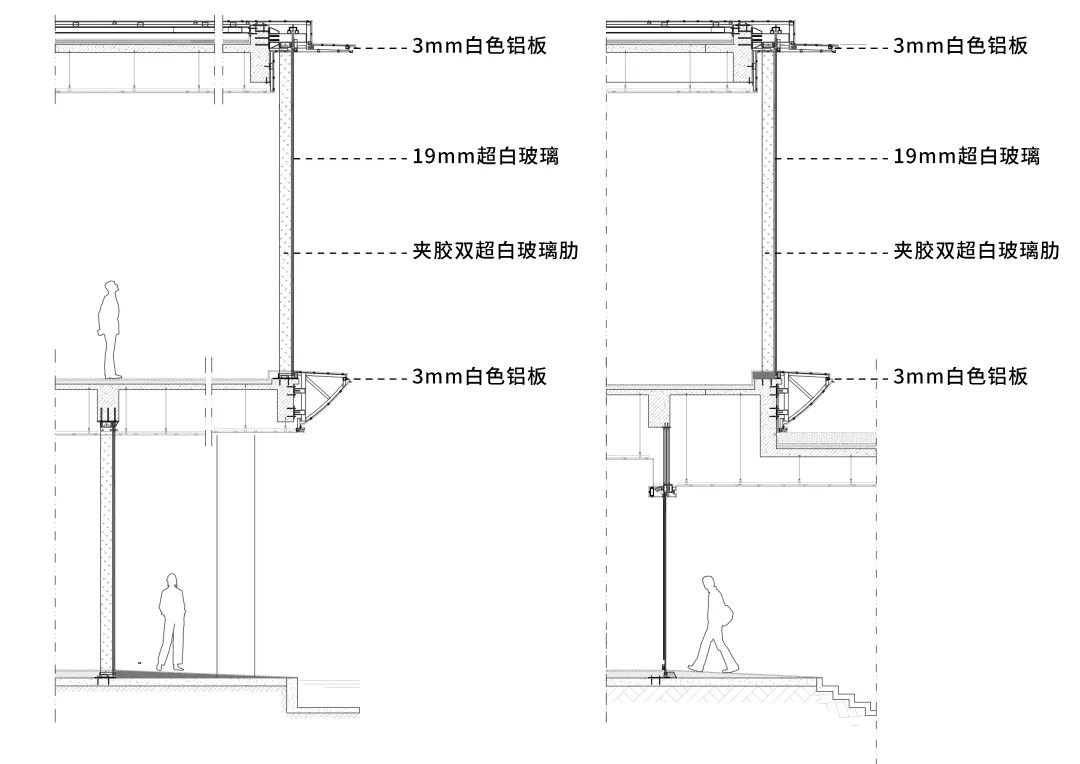 建筑立面通過(guò)鋁板和玻璃的組合,材質(zhì)的特性產(chǎn)生強(qiáng)烈的反射與通透的對(duì)比,既是各成領(lǐng)域又互相映襯,使得建筑的質(zhì)感細(xì)膩精致。同時(shí),玻璃、水面的鏡面反射與鋁板的漫反射交匯共生,水面倒影建筑輪廓,玻璃反射樹(shù)影與天空,形成一幅光影變幻的生動(dòng)場(chǎng)景。