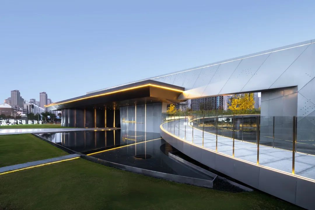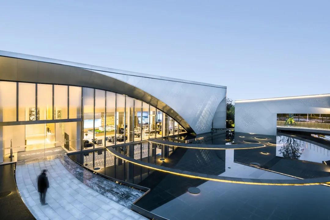 獨特的示范區(qū)入口門頭設(shè)計,三角形交錯切割搭的頂蓋搭配弧與圓變形拼接的墻體,選用與建筑表面相同的鋁板材質(zhì),讓每一個到訪的客戶都能體會到尊貴大氣的儀式感。大門整體框架為線條設(shè)計感十足的多邊幾何形,肆意張揚的角,似無限延伸的線,百變的面富有動感?!坝薄ⅰ熬邸?、“觀”一氣呵成。整體為黑白色調(diào),純粹簡約,同樣不缺少高級質(zhì)感。從內(nèi)延伸至外的水面,倒映著藍(lán)天白云,似天地顛倒闖入一片幻境,似夢而非夢。
