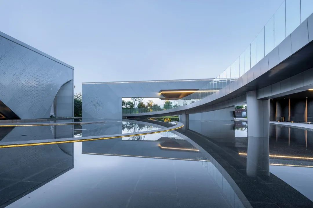 空間與視覺的連續(xù)性:立面的墻體通過藝術(shù)創(chuàng)作產(chǎn)生視覺上的肌理感,將光與影帶入到空間中,微風(fēng)拂過水波倒影連廊起伏,層層漣漪之上倒映出朦朧的樹影與建筑。運用玻璃等半透明材料,舒朗別致的造型結(jié)構(gòu)打破景觀與建筑的界限,打造空間與視覺的連續(xù)性與純凈性。