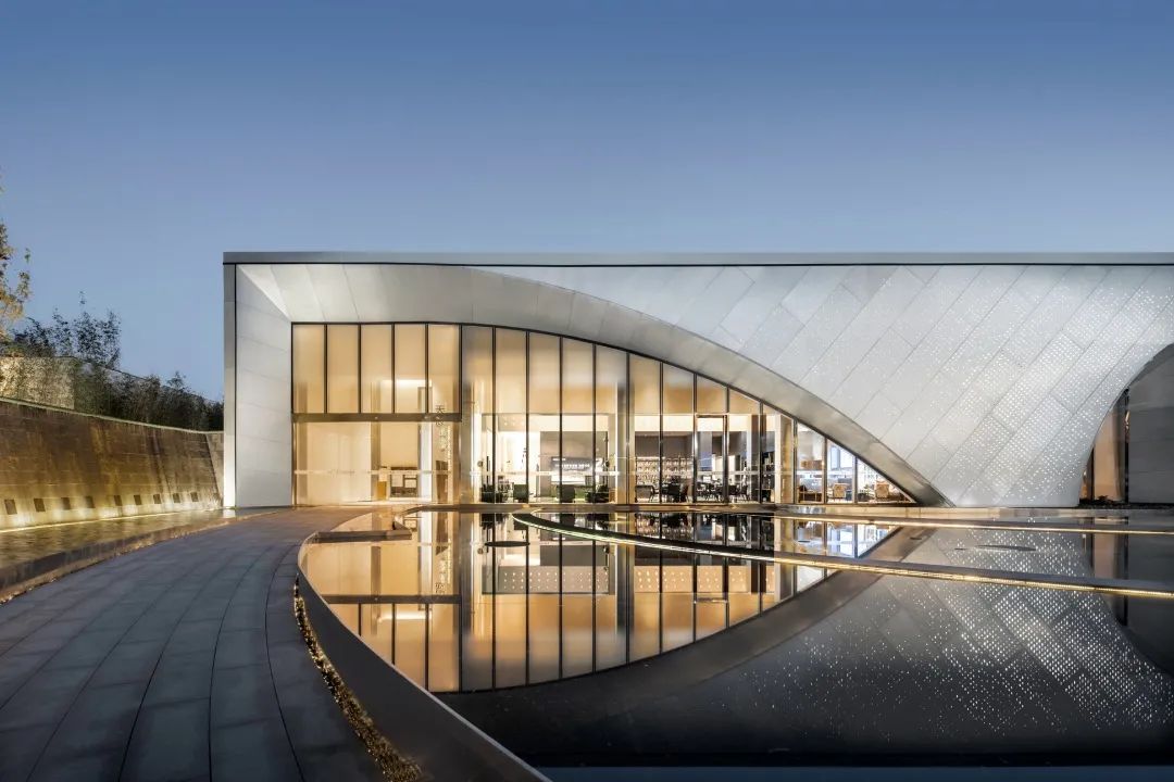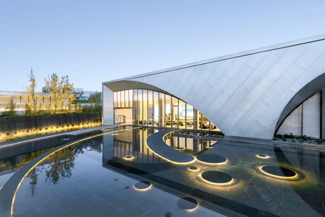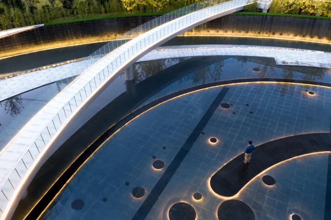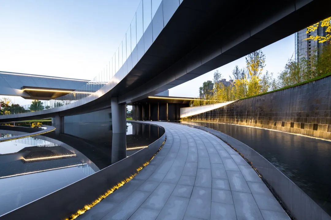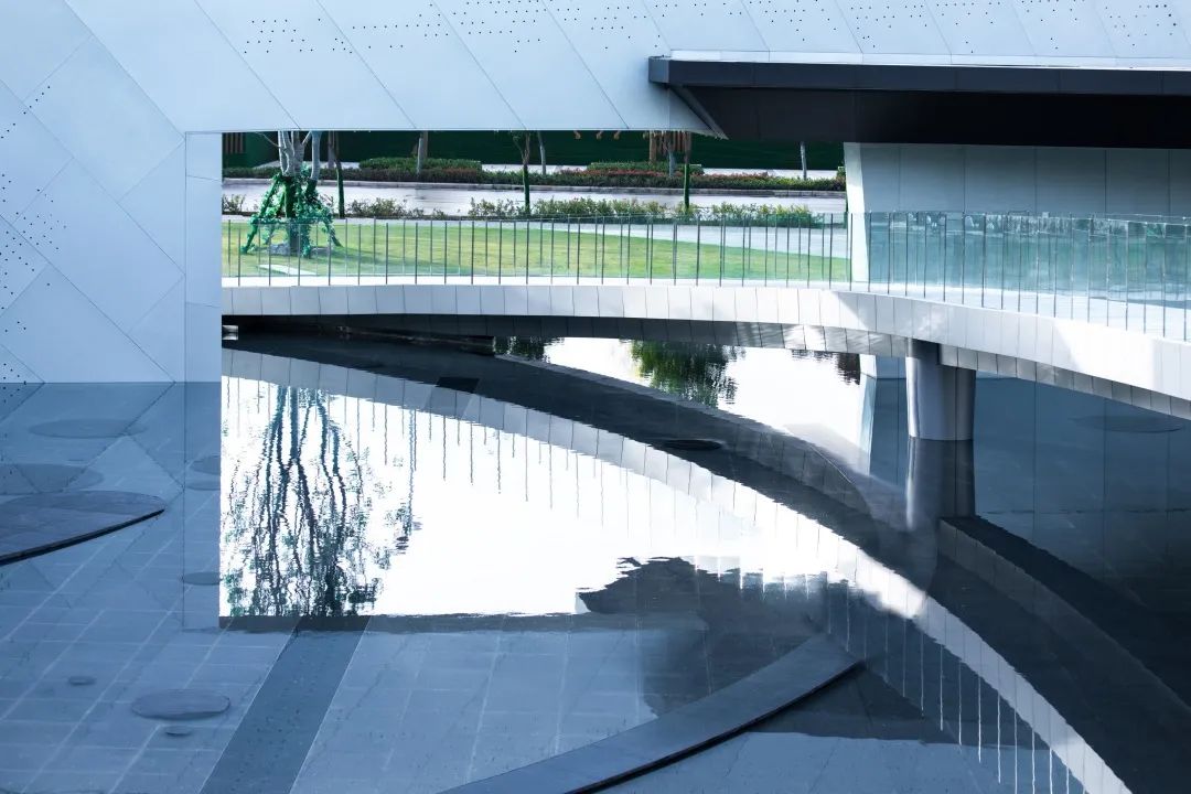空間與視覺(jué)的連續(xù)性:立面的墻體通過(guò)藝術(shù)創(chuàng)作產(chǎn)生視覺(jué)上的肌理感,將光與影帶入到空間中,微風(fēng)拂過(guò)水波倒影連廊起伏,層層漣漪之上倒映出朦朧的樹(shù)影與建筑。運(yùn)用玻璃等半透明材料,舒朗別致的造型結(jié)構(gòu)打破景觀與建筑的界限,打造空間與視覺(jué)的連續(xù)性與純凈性。