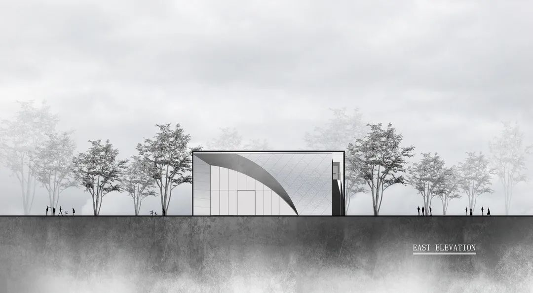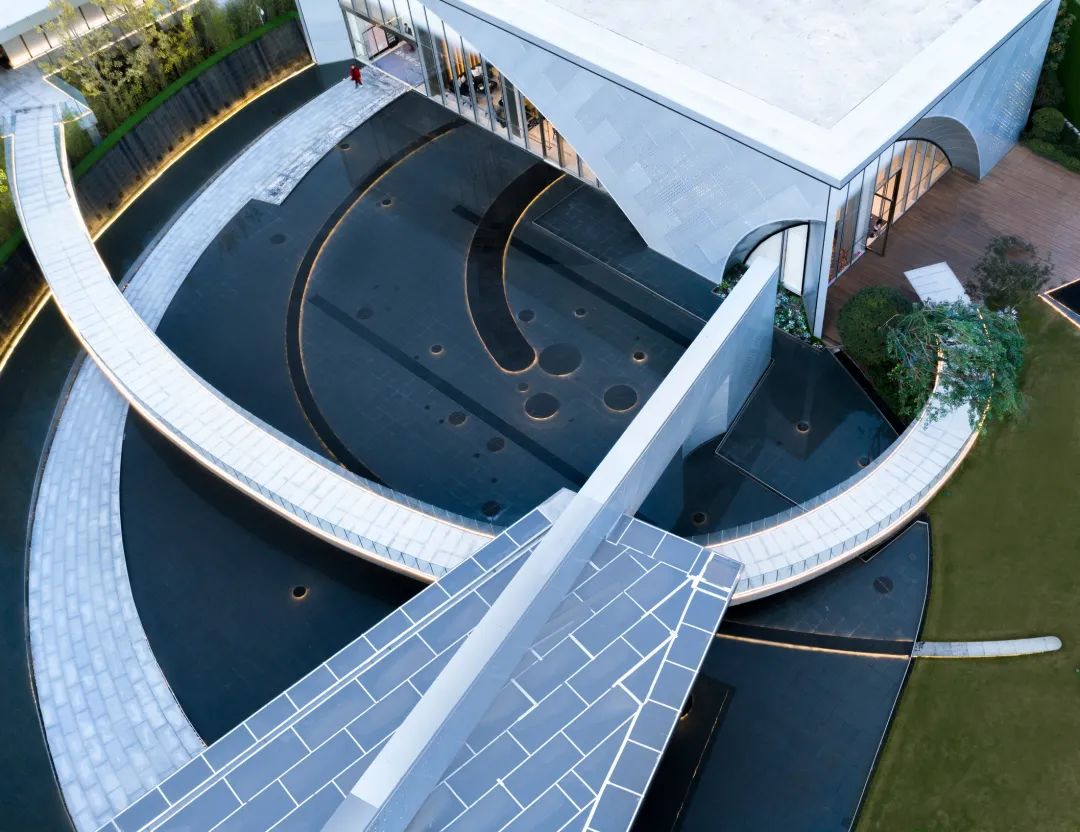 曲線形和方形的空間,與景觀的廊橋相互回應(yīng)。建筑立面的曲線與景觀廊橋的曲線延續(xù)統(tǒng)一,這是一條隱性的認(rèn)知流線——向上、向內(nèi)、向光,懸隔日常,劃過(guò)銀河,回歸自我。