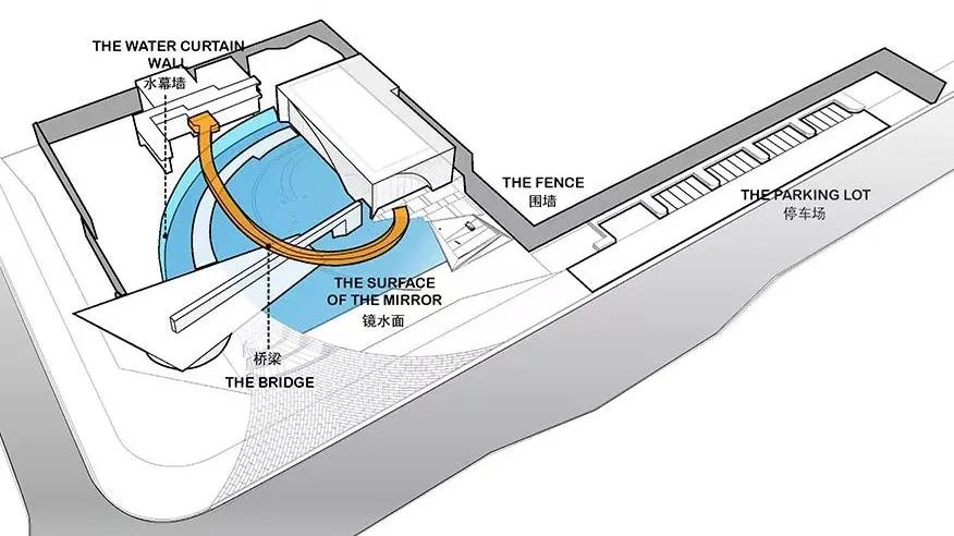 進(jìn)入場(chǎng)地后的主要觀賞空間是眼前的大面積鏡面水景,水景往往給人無(wú)限延伸的神秘感和想象力。通過(guò)水景人們可以看到周?chē)拿繒r(shí)每刻變化,她如同媒介,搭起了人與自然溝通的橋梁。
