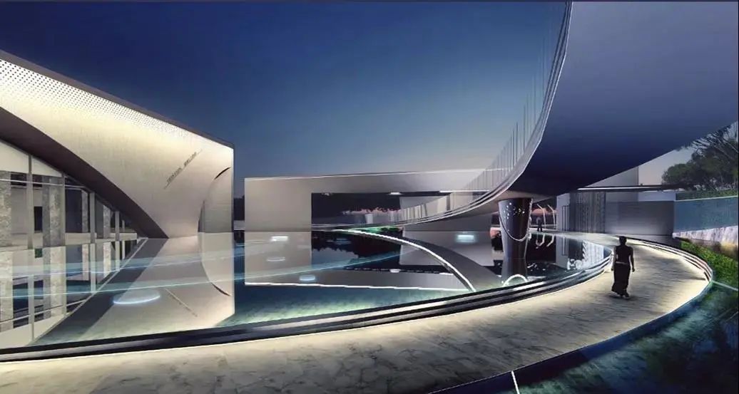 在示范區(qū)中構(gòu)建一座飛橋,兩側(cè)橋板采用半透明玻璃材質(zhì),整體形態(tài)以平滑曲線的設(shè)計(jì)方式連接售樓處和樣板房,增加了整個(gè)空間的層次感,在視覺(jué)上豐富客戶游覽體驗(yàn)感。漫步在飛橋之上,可以感受到自己是整個(gè)空間的主角,你就是別人眼中最美的風(fēng)景;行走在橋下,橋與一側(cè)的水幕墻結(jié)合,可以感受到一種空靈縹緲的意境。