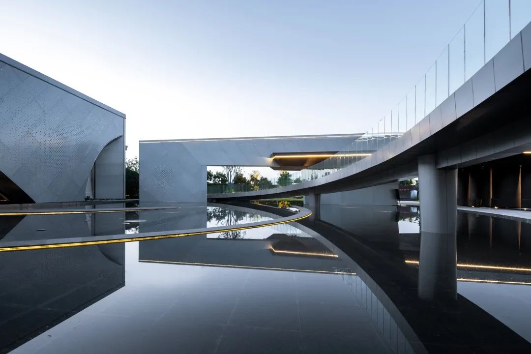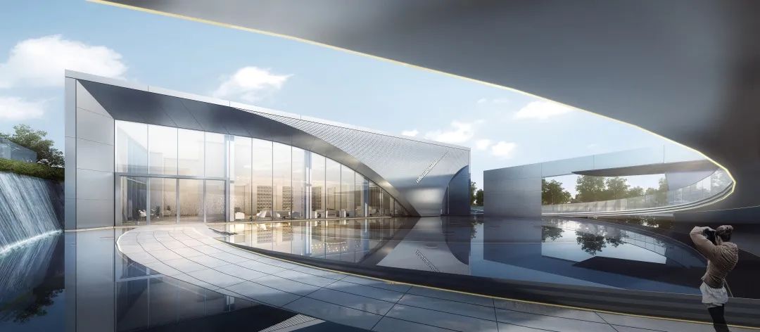 獨(dú)特的示范區(qū)入口門(mén)頭設(shè)計(jì),三角形交錯(cuò)切割搭的頂蓋搭配弧與圓變形拼接的墻體,選用與建筑表面相同的鋁板材質(zhì),讓每一個(gè)到訪的客戶都能體會(huì)到尊貴大氣的儀式感。大門(mén)整體框架為線條設(shè)計(jì)感十足的多邊幾何形,肆意張揚(yáng)的角,似無(wú)限延伸的線,百變的面富有動(dòng)感?!坝?、“聚”、“觀”一氣呵成。整體為黑白色調(diào),純粹簡(jiǎn)約,同樣不缺少高級(jí)質(zhì)感。從內(nèi)延伸至外的水面,倒映著藍(lán)天白云,似天地顛倒闖入一片幻境,似夢(mèng)而非夢(mèng)。