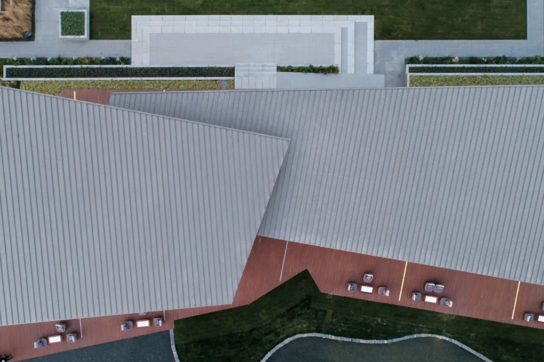 方案早期的屋面排水方案因屋頂造型的斜向坡度,排水集中在中間??紤]到暴雨天氣下,中央排水將會影響到出入口的人員出行。技術(shù)團(tuán)隊(duì)經(jīng)過多輪調(diào)整,在完全不影響立面效果的前提下,調(diào)整鎂鋁錳板直立鎖邊方向及南北朝向標(biāo)高,將排水改為南面分散式排水,保證了極端天氣情況下建筑的人員出行。